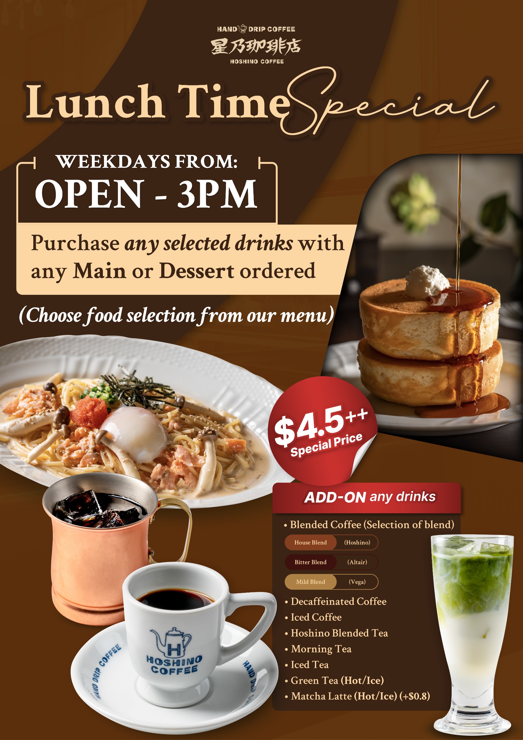 Don’t miss our lunch specials! Add-On Drinks from only $4.5++